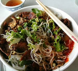 A great Family owned Vietnamese restauraunt. Vung Tau Pho Grill. Rice noodle soup in beef broth topping with meat red green onion and cilantro served with fresh basil bean sprouts lime and chili.