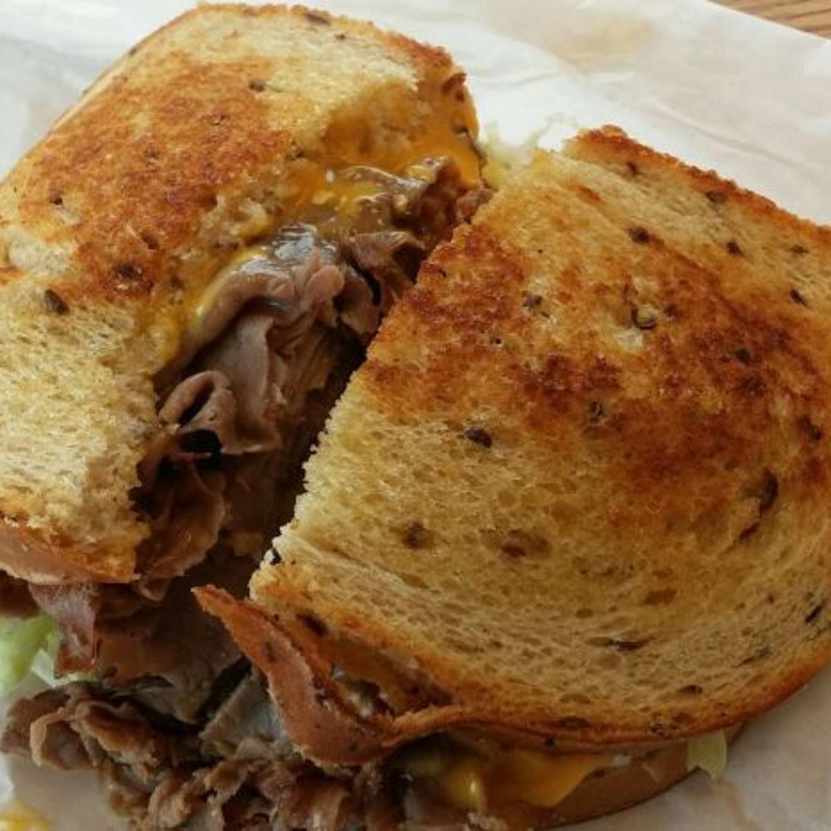 Pastrami and corned beef mixed together grilled on rye with Swiss cheese mustard and pickles - One. It is an icon with title Star Box. Crown Point Indiana USA.